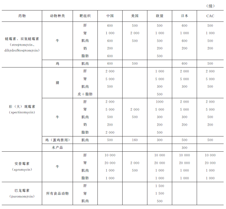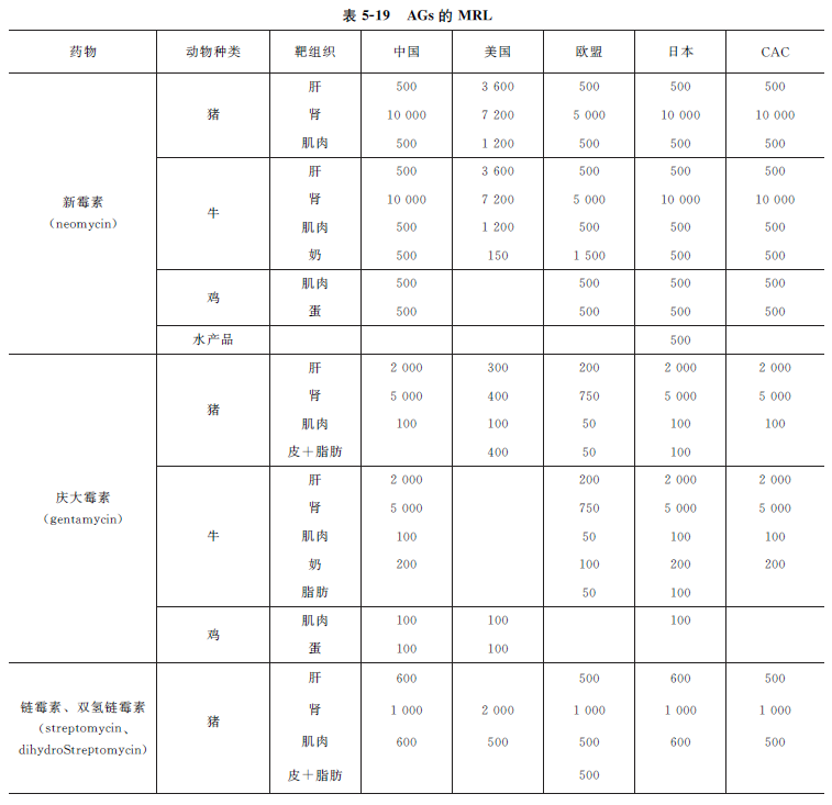 目前,欧盟明确规定,禁止使用AGs作为家畜的生长促进剂。许多国家和地区对AGs残留制定了严格的限量标准,如表5-19所示。
