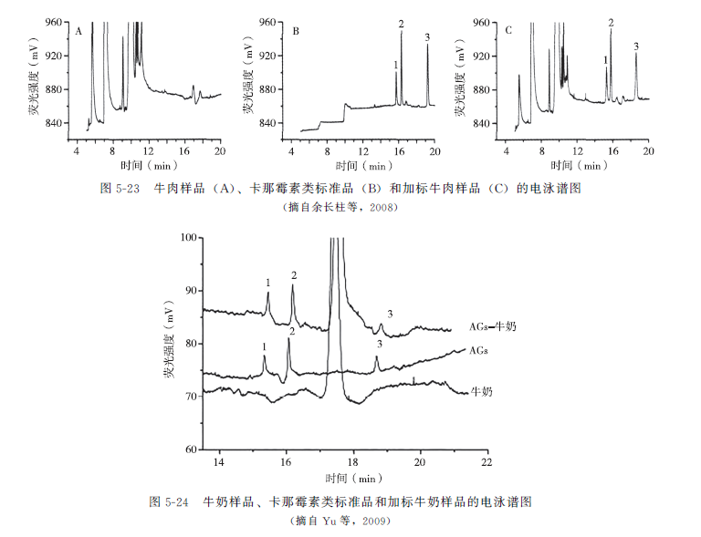 采用CE检测AGs时,检测器的选择对物质的分离有着重要影响,其中激发荧光检测器(LIF)的灵敏度最高。Serrano和Silva采用CE-LIF法检测牛奶中卡那霉素B、阿米卡星、新霉素B、巴龙霉素Ⅰ,经过硫代靛青琥珀酰亚胺酯(Cy5NS)衍生化,用MEKC分离、LIF检测,方法检测限为0.5~1.5μg/kg。余长柱等采用50mmol/L乙酸-乙酸钠缓冲液()+0.5mmol/L十六烷基三甲基溴化铵溶液为分离缓冲液,组织样品用10%三氯乙酸提取滤过后在-15kV下分离,与柱后衍生试剂1.0mmol/L萘二醛+8.0mmol/L2-巯基乙醇+35mmol/LNa2B4O7()的30%(V/V)甲醇溶液反应,激发诱导荧光检测器于473nm处检测,卡那霉素A、妥布霉素、阿米卡星检出限分别为36μg/kg、42μg/kg、52μg/kg,回收率为90.2%~95.3%(图5-23)。此方法也可用于牛奶中卡那霉素A、妥布霉素、阿米卡星残留分析(图5-24)。