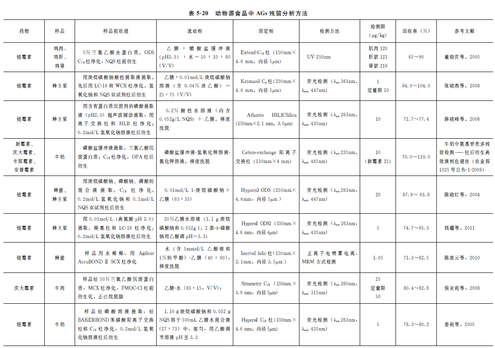 大多数检测方法均为衍生化法,邹月利报道了以甲醇-乙腈-0.1mol/L草酸为流动相、以C18柱为固定相,用HPLC(365nm)直接检测蜂蜜中链霉素含量,方法检测限为10μg/kg,回收率为89.0%~110%。部分动物源性食品中AGs残留的液相色谱分析方法见表5-20。