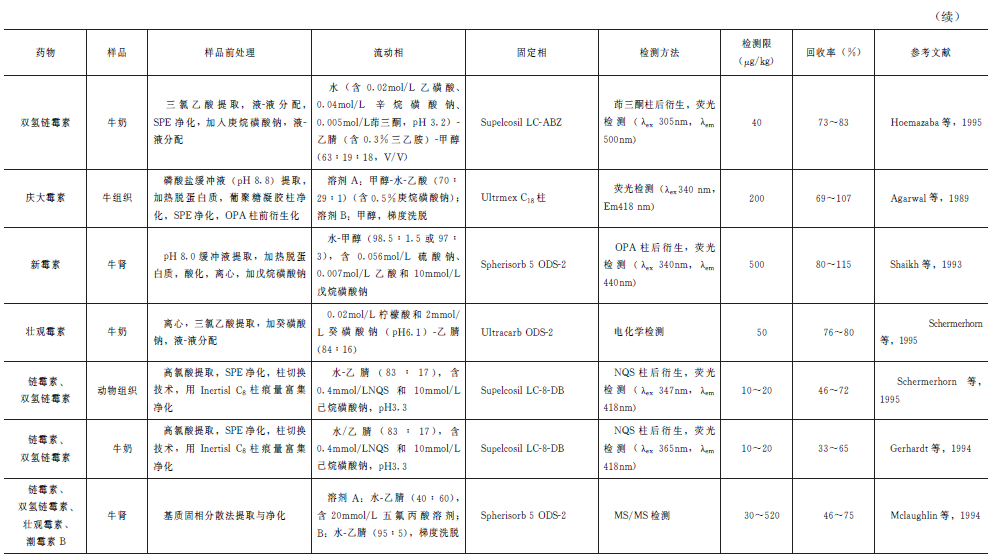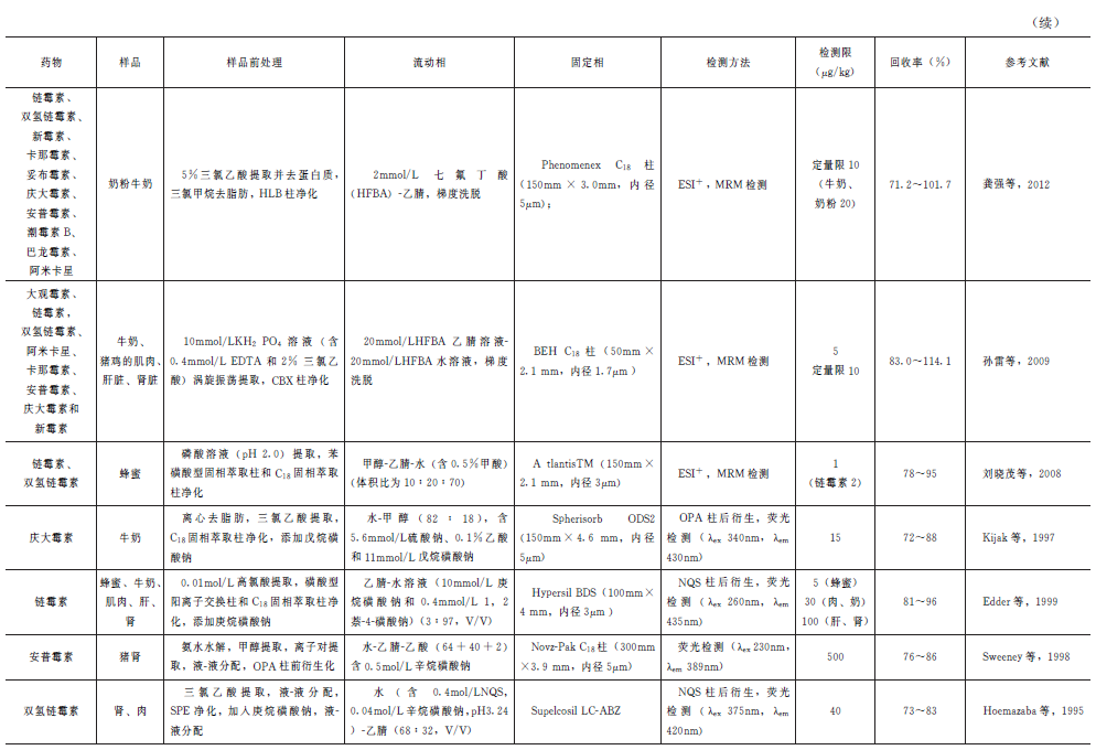 Berrada等采用ASE提取了肌肉中的双氢链霉素、链霉素、壮观霉素和螺旋霉素,方法回收率70%~96%,检测限为1~6g/kg。
