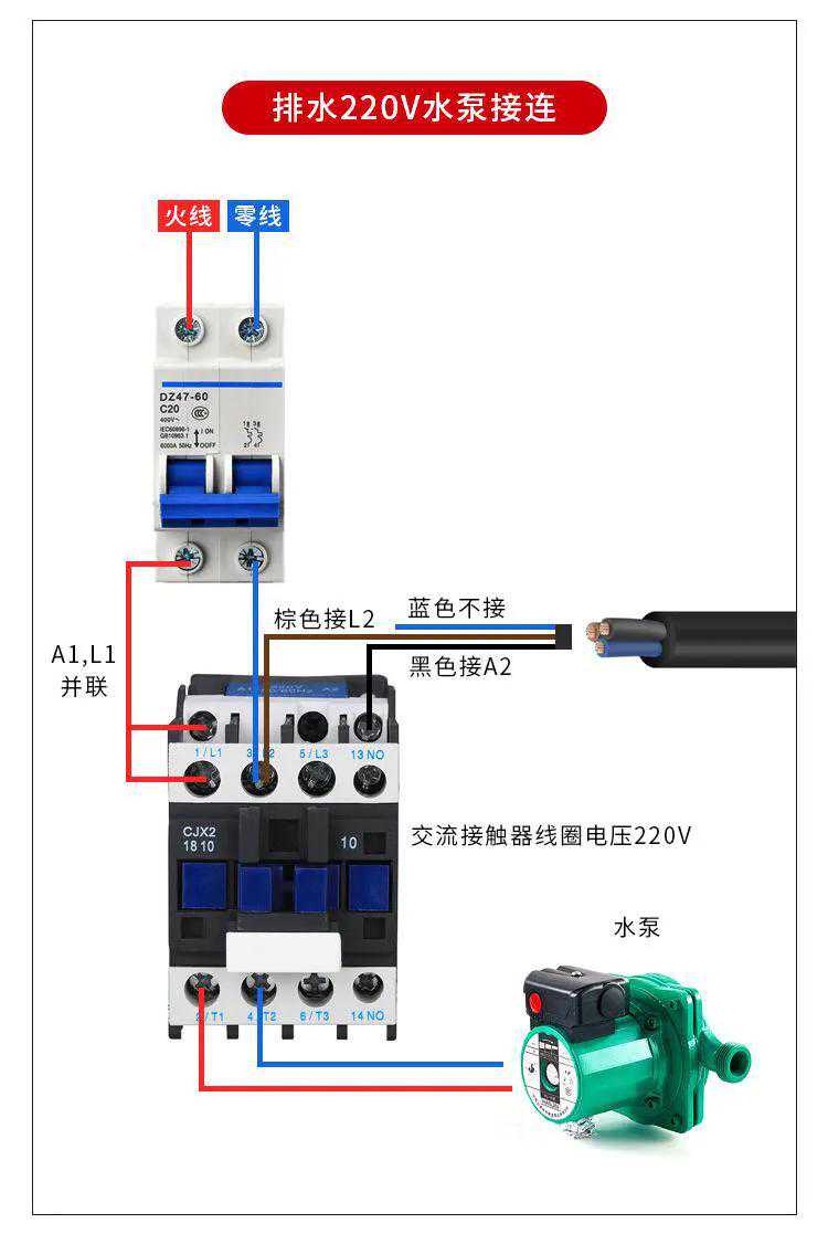 自动补水就用常闭(黑+蓝)另一根包好,自动排水反之。对于1KW以下220V泵,可直接串联电源在火线里,大于1KW或380V需要把开关串联在交流接触器或中间继电器线圈里。