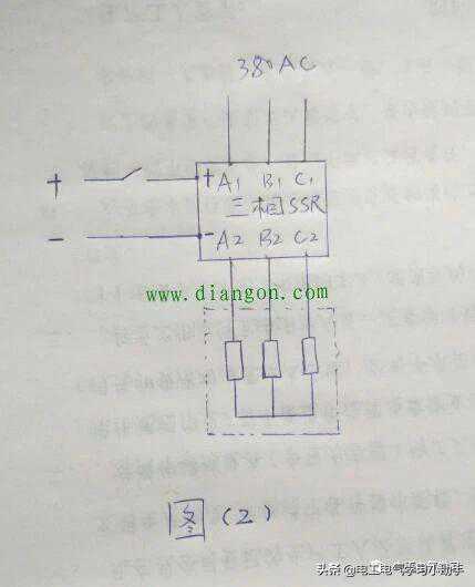 (2)三相交流固体继电器。它集三只单相交流固态继电器为一体,以两个输入控制端对三相负载,进行直接开关切换,可方便的控制三相电机、加热器等三相负荷。接线如图(2)所示。