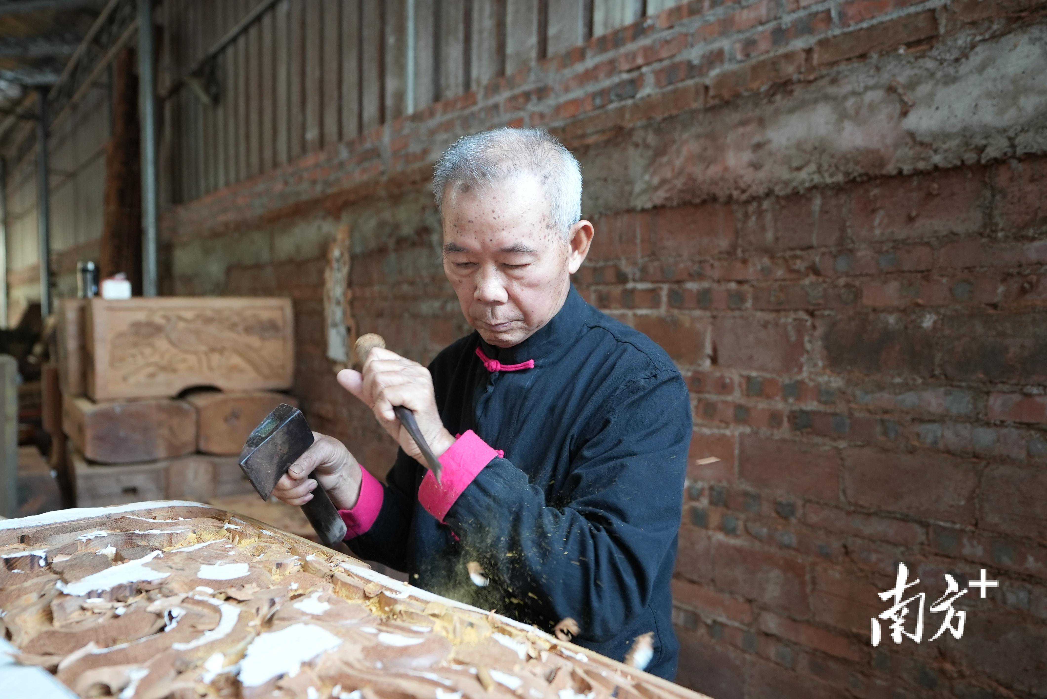 取材、刨光、打磨、设计作画、凿刻、打胚、打磨修光……经过多道工序,一根木头在工匠手中呈现出一个个生动的图案。眼前这个正在一刀一凿雕刻的南三镇尾兴村村民,是湛江市级非遗南三古建筑木雕刻传承人林进和。
