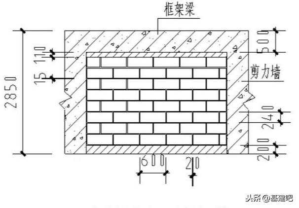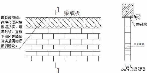 4)、填充墙砌至接近梁底、板底时,应留一定的空隙,待填充墙砌筑完并至少间隔7d后,再将其补砌挤紧,防止上部砌体因砂浆收缩而开裂。方法为:当上部空隙小于等于20mm时,用1:2水泥砂浆嵌填密实;稍大的空隙用细石混凝土镶填密实;大空隙用烧结标准砖或多孔砖呈60°角斜砌挤紧,但砌筑砂浆必须密实,不允许出现平砌、生摆(填充墙上部斜砖砌筑时出现的干摆或砌筑砂浆不密实形成孔洞等)等现象。