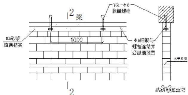 (4)配筋砖砌体砌筑前必须做现场标示牌,墙体压筋按设计规格尺寸埋设,直接按40cm距离两皮砖植2根Φ6,局部墙体不少于500cm设计图纸长度压置通长钢筋。