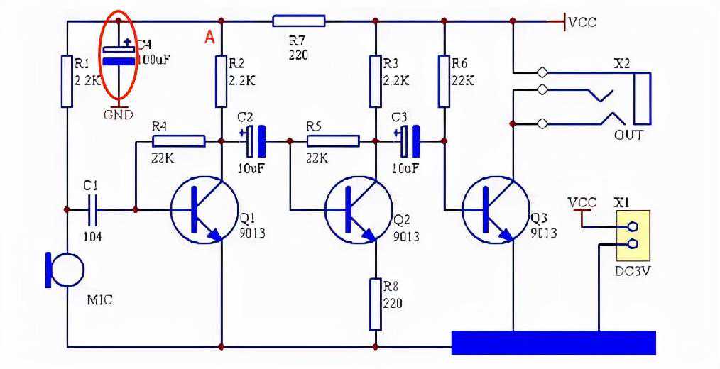 如上图所示,两级放大器直流电压供给电路之间加入退耦电容C4后,电路中A点上的交变信号被C4短路到地端,而不能通过电阻Rl加到Q1基极。这样,多级放大器中就没有级间的交连现象,从而达到了消除电路之间的寄生耦合的目的。