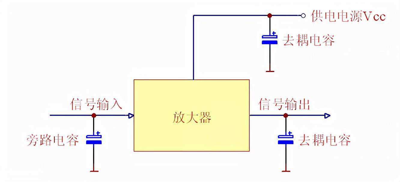旁路电容的主要功能是当混有高频和低频的信号经过放大器时,要求通过某一低频信号,而阻碍高频信号,则在输入端加一个适当大小的接地电容,使高频信号很容易通过此电容被旁路掉(这是因为电容的高频阻抗小),而低频信号由于电容对它的阻抗较大而被输送到下一级。