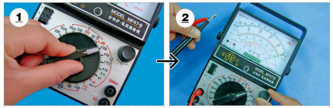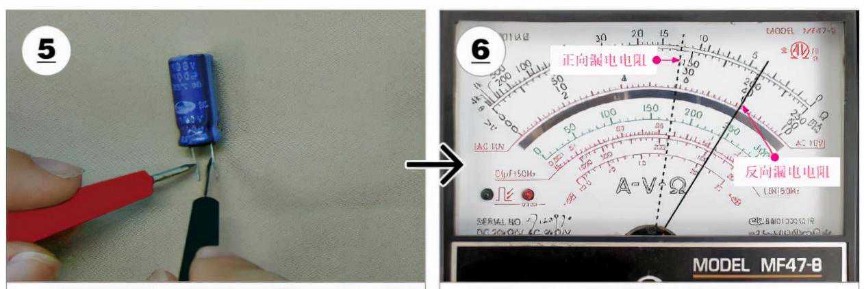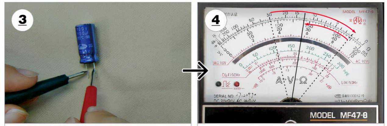 检测电解电容时,除了使用数字万用表检测电容量是否正常外,还可以使用指针万用表检测较大电解电容的充、放电过程,通过对电解电容充、放电的检测判断被测电解电容是否正常。如下图所示,为用指针万用表检测电解电容的充、放电操作。