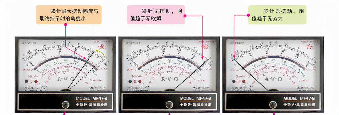 3)若表笔接触到电解电容的引脚后,表针没有摆动,仍指示阻值很大或者趋于无穷大,则说明该电解电容中的电解质已经干涸,失去电容量。