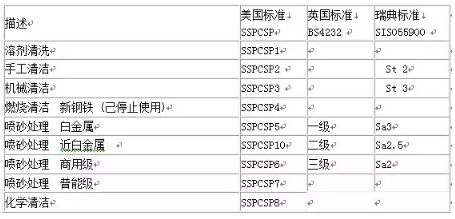 也即清洁度,代表性国际标准有两种:一种是美国85年制订“SSPC-”;第二种是瑞典76年制订的“Sa-”,它分为四个等级分别为Sa1、Sa2、、Sa3,为国际惯常通用标准,详细介绍如下: