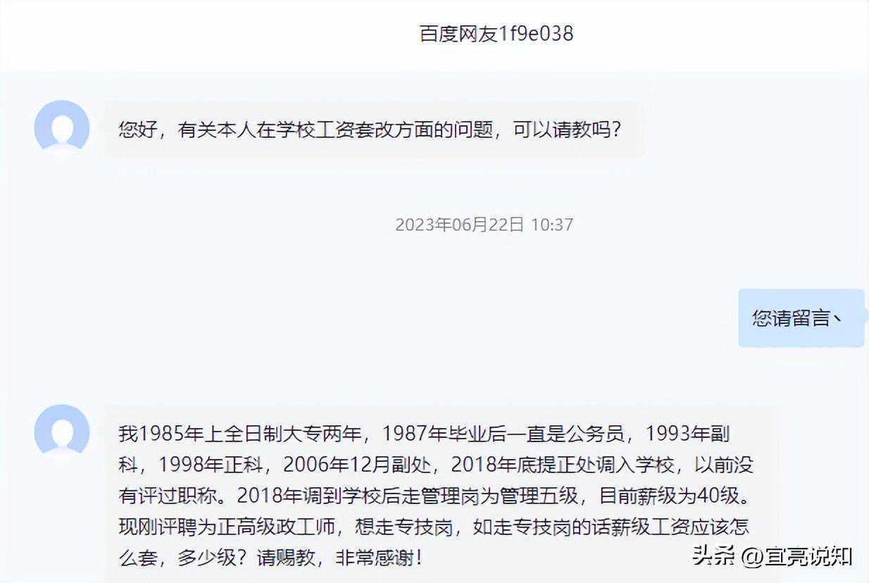 我1985年上全日制大专两年,1987年毕业后一直是公务员,1993年副科,1998年正科,2006年12月副处,2018年底提正处调入学校,以前没有评过职称。2018年调到学校后走管理岗位管理五级,目前薪级为40级。现刚评聘为正高级政工师,想走专技岗,如走专技岗的话薪级工资应该怎么套,多少级?请赐教,非常感谢!