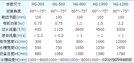 设备规格按机宽尺寸分HF300-3600型。机宽超过1800mm,则做成并联机。栅隙分为1mm、3mm、5mm、10mm、20mm、30mm、40mm、50mm等各种规格,由过水量、提升高度、固液分离总量和所分离物质的形状、颗粒大小来选择栅隙。可根据用户需要选用材质为ABS工程塑料、尼龙、不锈钢的耙齿制作;主体框架有不锈钢材质和碳钢防腐两种。