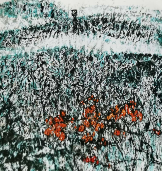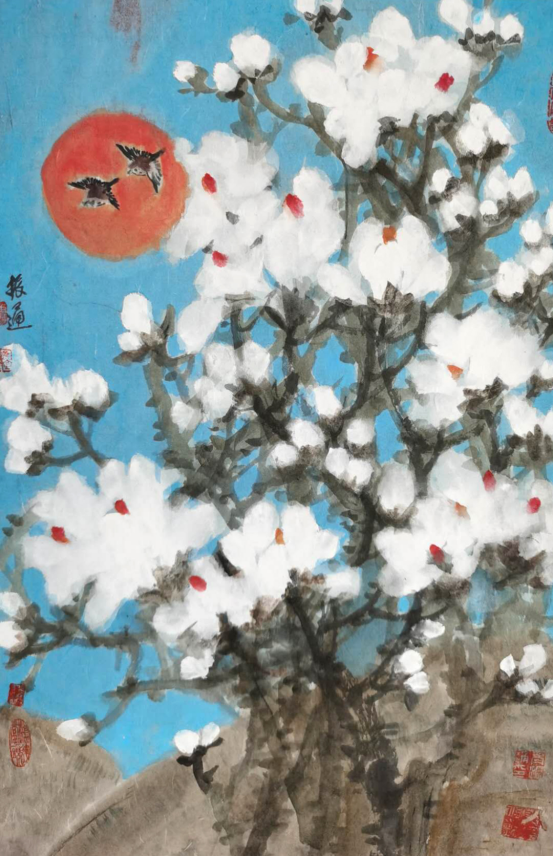 角振通还尝试着用不同材料来创作绘画作品,比如说用丙烯来着色,来体现国画技法中所达不到的效果,这种突破在他的很多作品中都有所体现,如《雪白血红》、《黑土地》、《向日葵》等。角振通说,中国画体现的是一种意境,用墨来体现出作者的心情和一些理念,它和西方画的色彩和追求三维立体的理念有所不同。我也是在努力的寻找着中西方绘画的联系,游走在中西艺术之间。