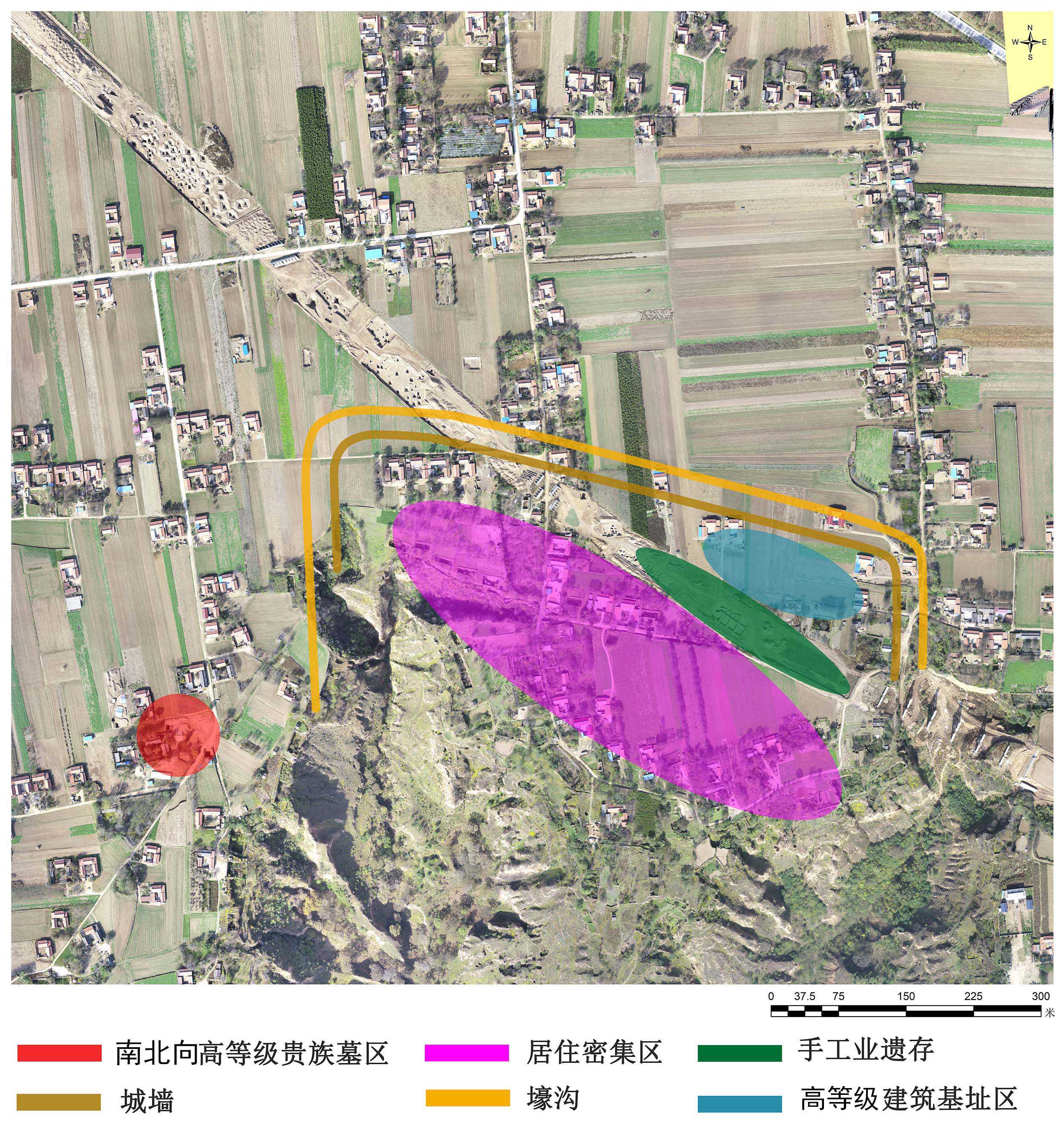 发现的壕沟位于城垣外侧,围绕城址周围。我们将北墙以外壕沟进行了局部解剖,发现其形制为口大底小倒梯形。高等级建筑基址区位于城址东北部,勘探发现有9座,已发掘4座,最大单体面积已超过200平方米。形制均为夯土高台建筑,其周围是料僵石铺砌的散水设施,建筑基址之间发现有以廊道相连的现象,这显示出其建筑群并非一组。一般居住区位于城址西北部,遗迹主体为房址。分为半地穴与平面立柱两类,之间多存在打破关系,显示出年代上有早晚之分。居住区部分房址发现有灶坑,周围有蓄水池、储藏坑、窖穴等遗迹,与同时期房址存在一定对应关系。遗迹中包含的遗物有陶器、骨器、石器等。在发掘高等级建筑区与一般居住区之间时,考古队发现,遗迹包含有大量灰坑、灰沟、窑址等,其中包含物多为生产工具,诸如骨锥、骨钻、骨针、纺轮等一类器物。我们初步认为与手工业一类遗存相关。对于城址外墓地分布情况,我们认为城址外西侧偏南,属东周时期南北向高等级贵族墓地。其西侧偏北及北部,又为东周时期南北向低等级贵族墓地和平民墓地。