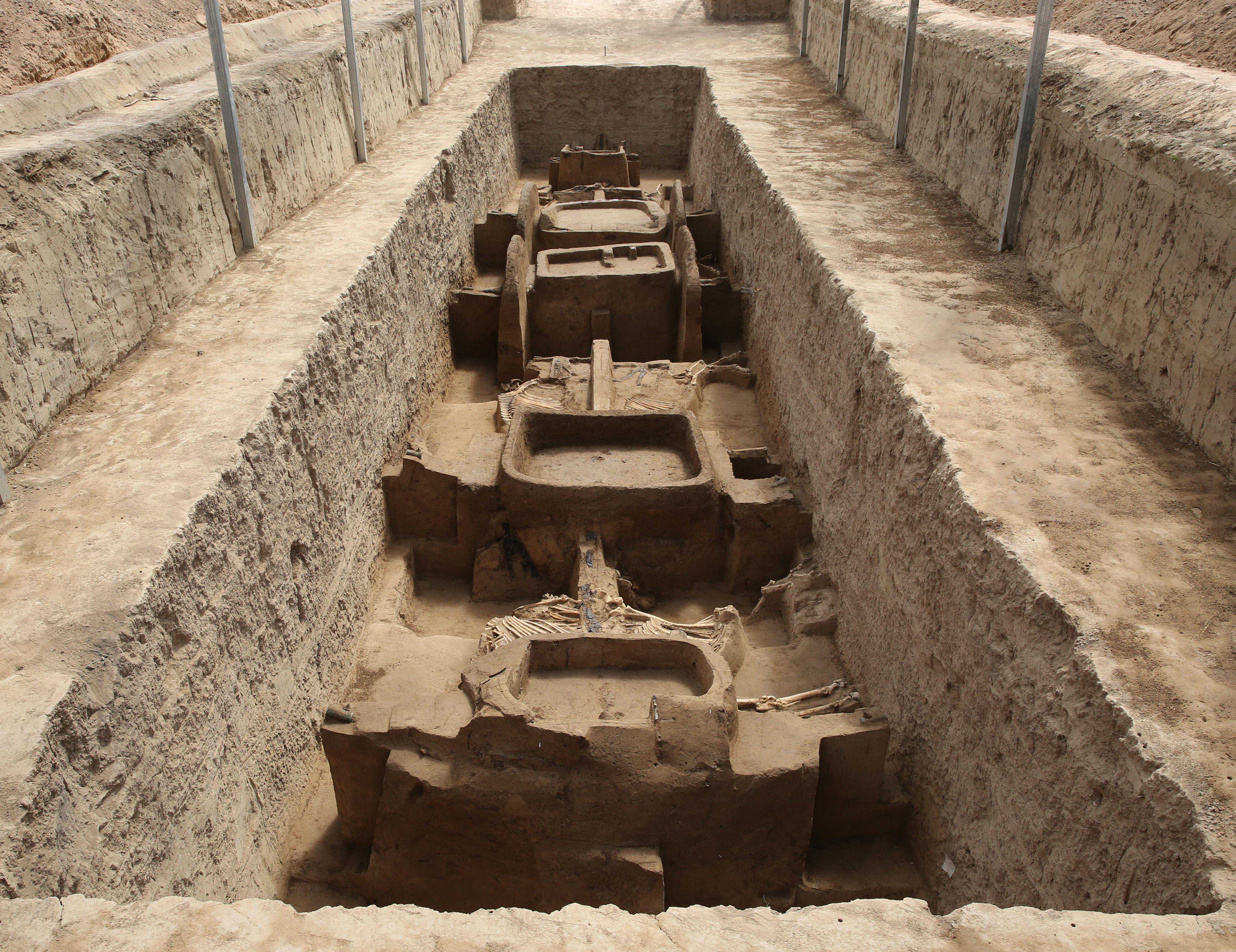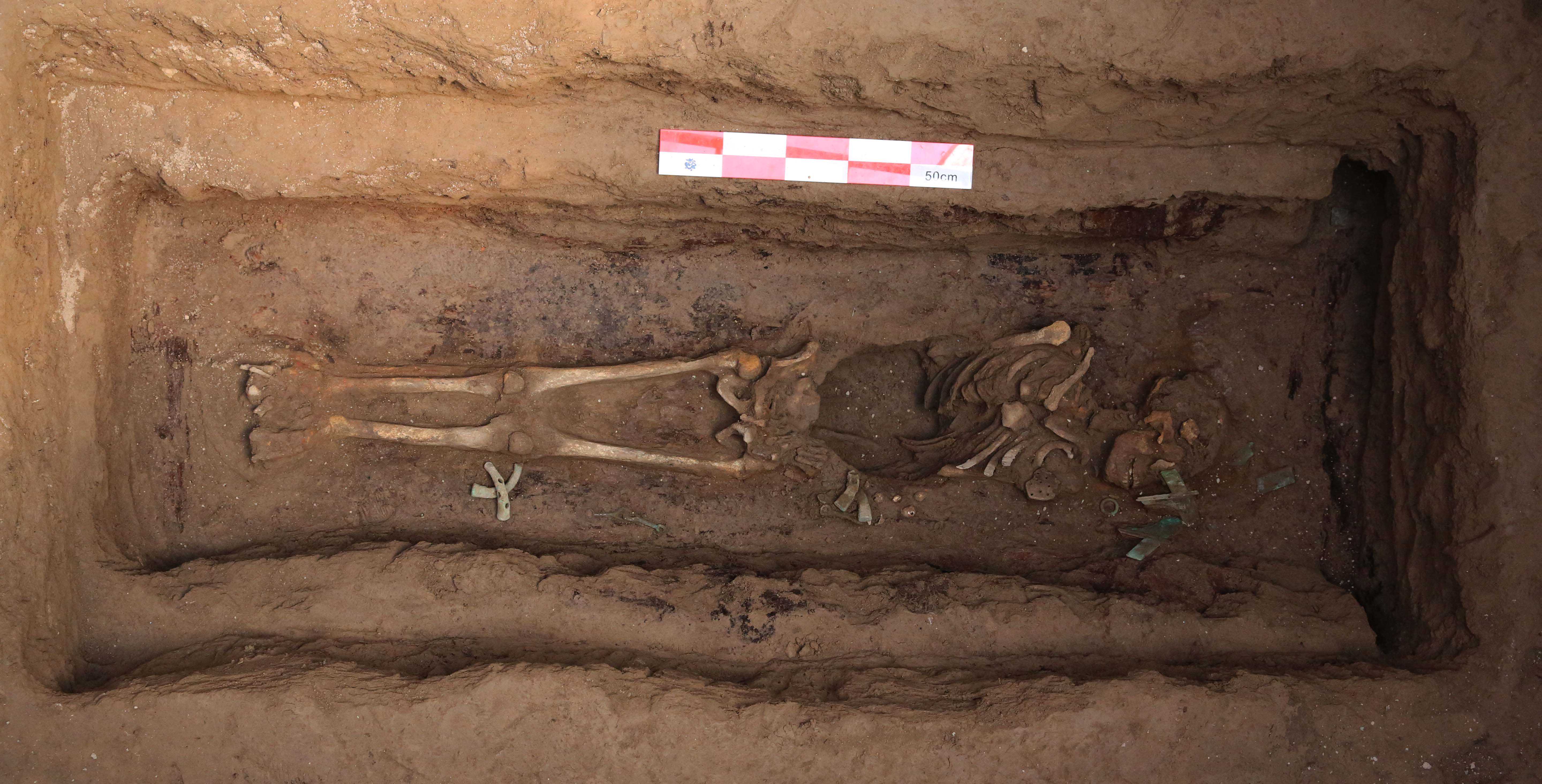 考古发掘工作从2016年开始,截止2020年,我们已清理发掘东周时期墓葬177座。这些墓葬分布都具有一定规律,很少出现早晚打破现象,这显示这片墓地在营建时就有一定的规划。墓葬形制特点也具有高度一致性,基本为南北向竖穴土坑,少量发现东西向,墓圹近底部流行二层台,墓室内多发现棺椁,墓主人葬式上仰身直肢葬和侧身屈肢葬都占有一定的比例。随葬品种类丰富,包含有铜器、金器、玉器、漆木器、石器、蚌器、泥器、陶器、瓷器等。按其功能又可分为礼器、兵器、车马器及墓主人近身之物等。考古队还发现了车马坑,较之墓葬,往往埋葬较浅。其中南北向车马坑发现1座(编号为MK2),埋葬特点上为车上马下。其中车1辆,明显经人为有意识分拆。马有29匹,也分两层,摆放较为整齐,未与车作驾乘状。2座为东西向,都为车马同坑、车马同层。其中MK5,殉车有5辆,东西向纵列。其中第1辆车无马,可能为人拉的辇车。第2至第5辆车为一驾两马,两服马分置于辕之两侧,作驾乘状。