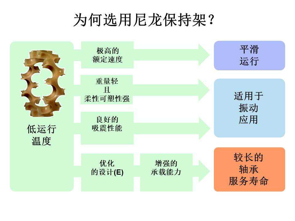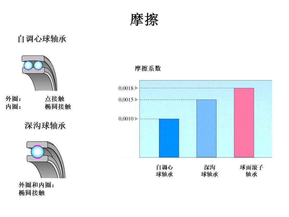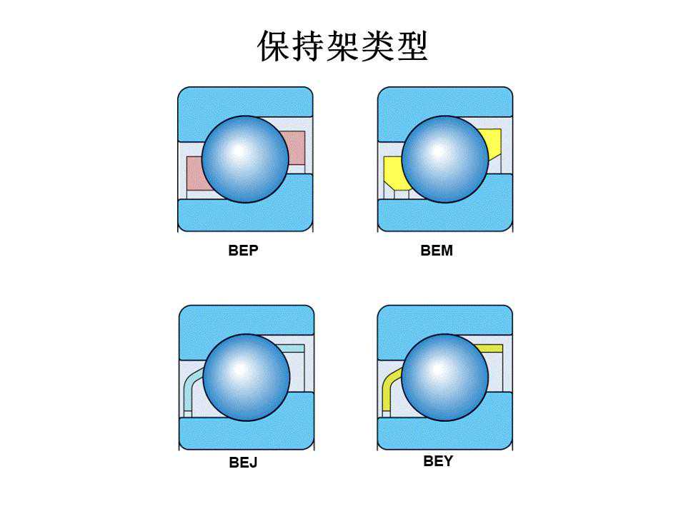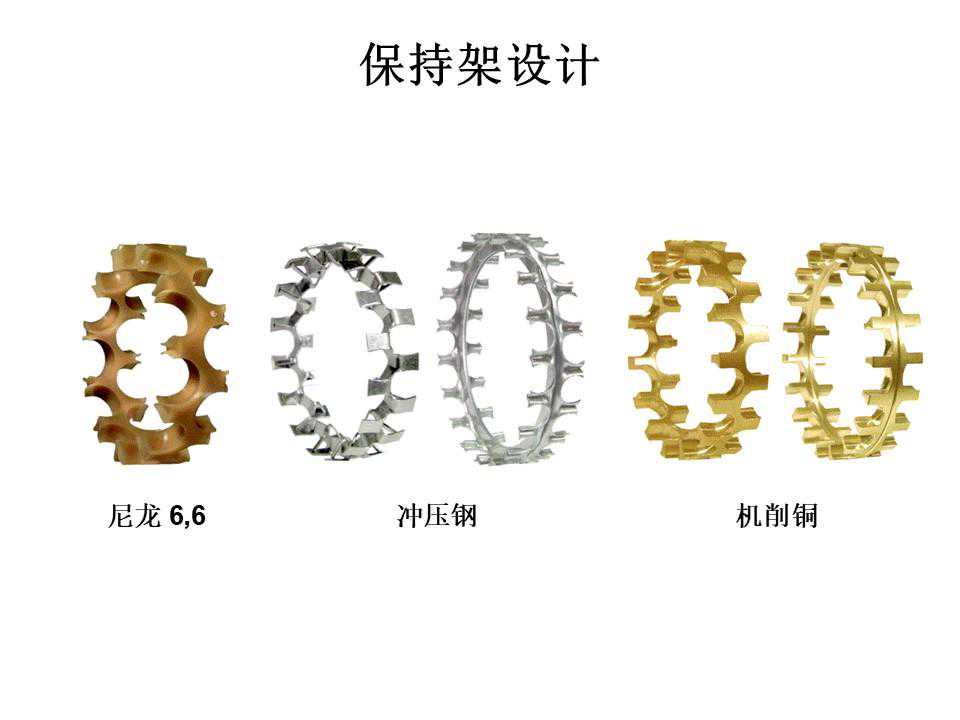 球轴承主要是由四个基本元件构成:滚珠(ball)、内环(innerring)、外环(outerring)与保持器也叫保持架(cageorretainer)。一般工业用的球轴承满足AISI52100的标准,滚珠与环通常是以高铬钢制成,洛氏硬度(RockwellC-scalehardness)约在61-65之间。而保持器的硬度相较于滚珠与环低,其材料有金属(如:中碳钢、铝合金)或非金属(如:铁弗龙、PTEF、高分子材料)。球轴承(ballbearing)比轴颈轴承(journalbearing)的转动摩擦阻力小,因此相同的转速下,摩擦产生的温度会比较低。