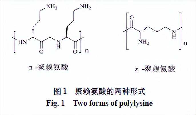 聚赖氨酸是一类特殊的酰胺类高分子聚合物,主要有ε-聚赖氨酸和α-聚赖氨酸两种形式存在,见图1[1-2]。α-聚赖氨酸是由L-赖氨酸和D-赖氨酸化学合成的聚合物,在生物医学应用中是有毒的[3],需进行修饰后使用。ε-聚赖氨酸是一种以L-赖氨酸为基础的由微生物产生的天然均聚酰胺聚合物[4-5]。起初ε-聚赖氨酸因其抑菌活性被发现,作为防腐剂在食品工业中应用[6],后因具有阳离子特性、水溶性、生物相容性和生物降解性等性质,引起了人们在其他领域应用的兴趣[7-9]。