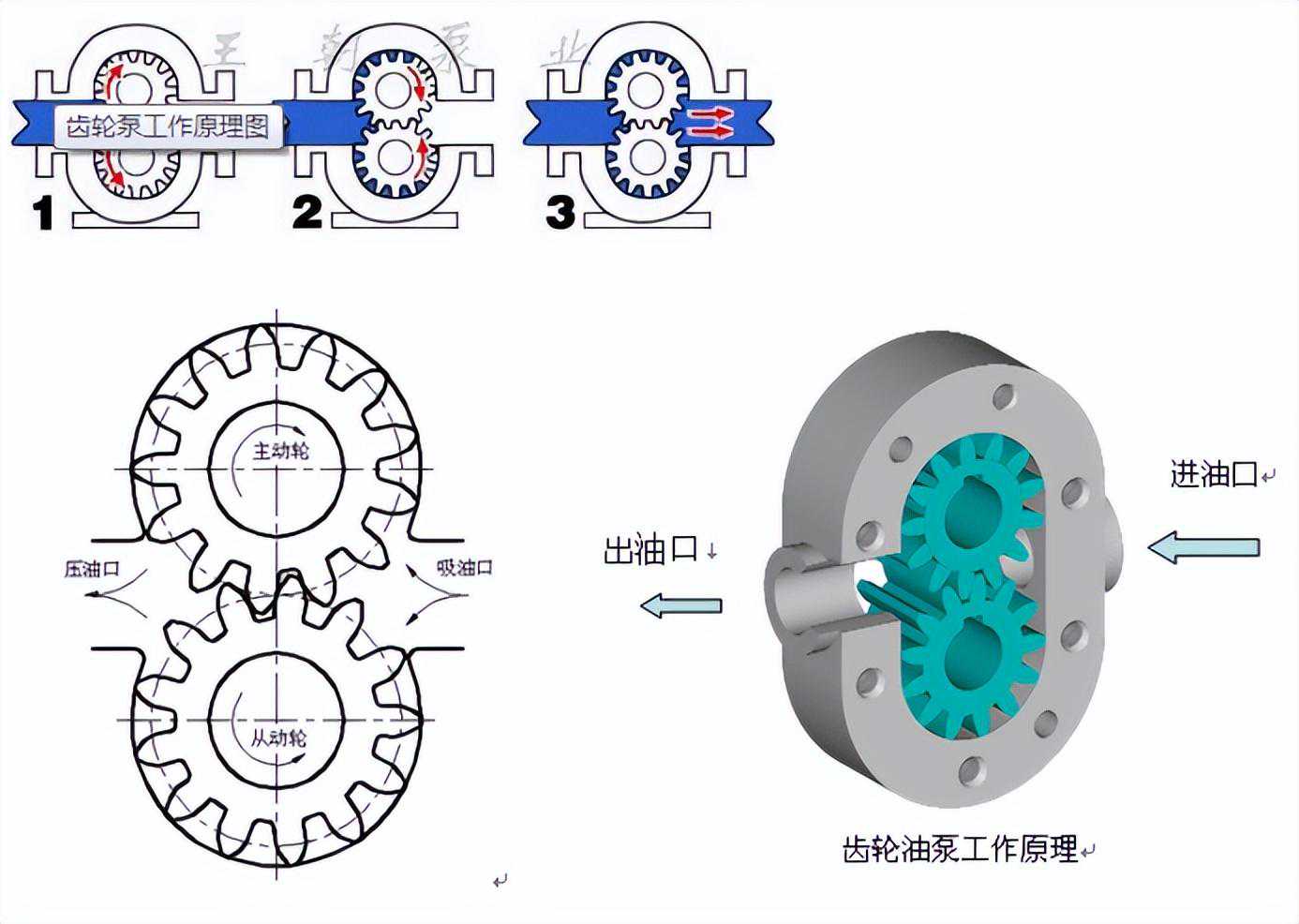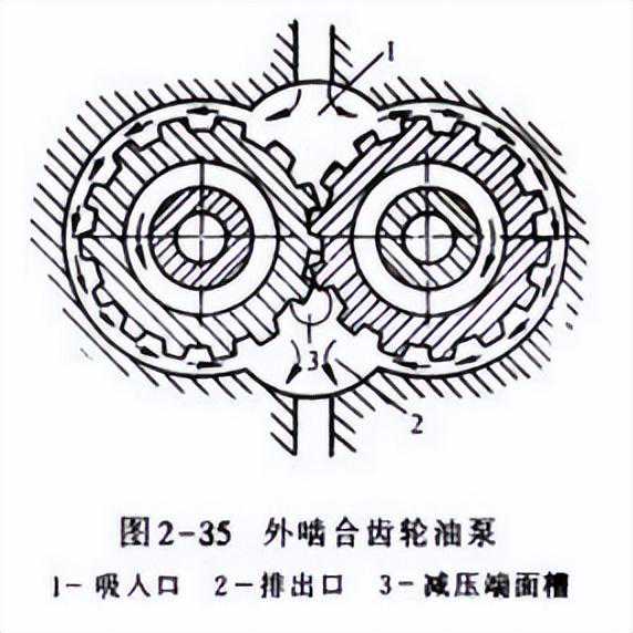 轮泵工作原理很简单,就是一个主动轮一个从动轮,两个齿轮参数相同,在一个泵体内做旋转运动。在这个壳体内部形成类似一个“8”字形的工作区,齿轮的外径和两侧都与壳体紧密配合,传送介质从进油口进入,随着齿轮的旋转沿壳体运动,最后从出油口排出,最后将介质的压力转化成机械能进行做功。以下是四张齿轮泵工作原理图: