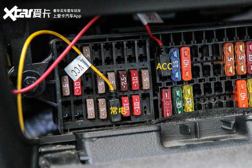 通过车辆的使用说明书或者试电笔,找到保险盒中的VCC常电保险以及ACC保险,红色ACC线可以在车辆启动时为盯盯拍X2SPro行车记录仪供电,而黄色的VCC常电线则能够在车辆熄火停车时,为盯盯拍X2SPro行车记录仪的停车监控功能提供电源。