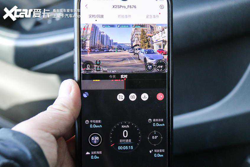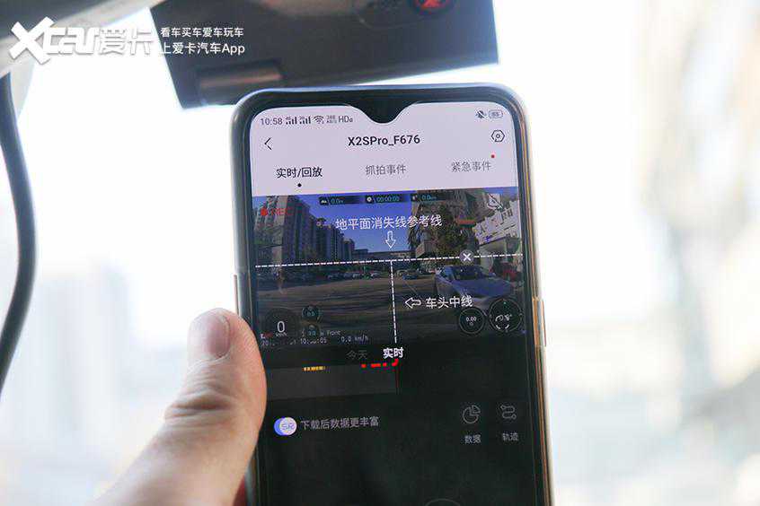 线束连接好之后,通过“盯盯拍APP”可以将手机和盯盯拍X2SPro行车记录仪主机进行连接,并且实时显示前路画面,这时可以利用安装辅助线很方便地找到合适的安装位置,并对前路摄像头进行调节。