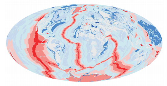 其中Kr为岩石导热率,dT/dz是地温梯度,因此热流值包含了该地的岩石热性特征。利用各地的获取的地温梯度等数据,再结合各地的地质岩性等情况,能够计算各地的热流值,由此合成了地热的数据集。众多科学家研究者利用这些数据集进行了全球的表面地热特征模拟,这就像是在给地球测体温。我们可以看到2010年Davies给出的全球的地温特征结果,热源的分布基本上在新生的洋壳,也就是板块边界。不过由于海洋数据以及两极数据的稀疏性,估计的误差也会偏大。