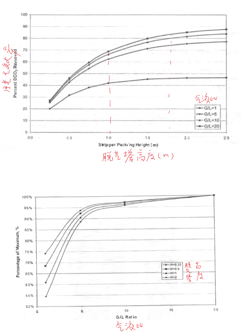 由下图可知脱⽓效率与填料塔⾼度呈正⽐,⼀般⾼度控制在1-1.5⽶左右,因为继续增加⾼度不会显著提⾼脱⽓效率,反⽽会增加⽔流阻⼒,减⼩⽔流速度。⽓液⽐与脱⽓效率呈正相关,⼀般控制在5:1-10:1左右,因为继续增加⽓液⽐,脱⽓效率同样不会显著增加。