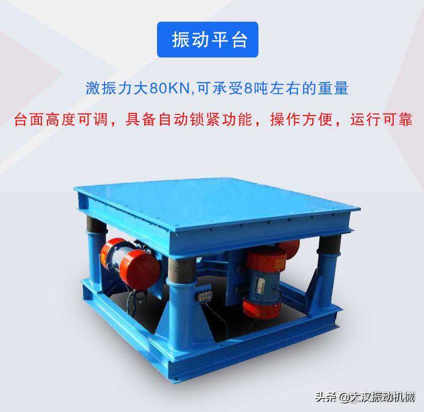 二维振动平台:使用一个或两个振动电机,主要用于上下振动,应用于混凝土模具、水泥预制件、人防门、吨袋包装等行业,功率为7.5kw。激振力为80KN,承载量可达8T。