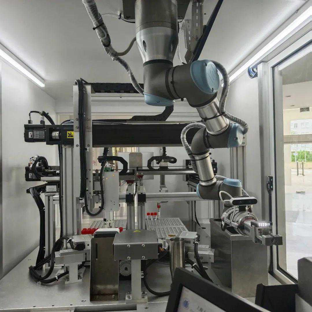 据介绍,该核酸采样机器人具有“全自动、非接触、大通量、高快速、云监控”等特色,将灵巧机械臂和小型自动化生产线有机融为一体,从拭子剥离、定位夹取、试管上位、试管扫码、口腔采样、样本剪切、试管下位,到采样末端的部位消毒等,全流程实现了真正自动化。