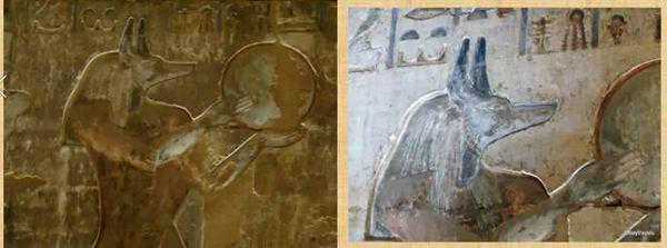 神庙与纸草版本《亡灵书》上的阿努比斯对比图