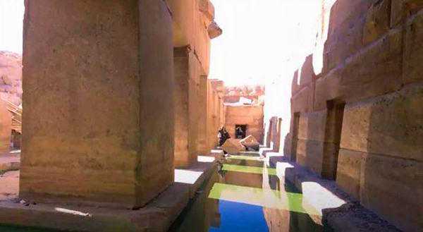 走过神庙的“L”型部分之后,是奥赛里翁,它是谢提一世时期开始修建,拉美西斯二世时期才完成的“奥赛里斯之墓”。这里与斯芬克斯旁边的神庙十分相似,特别是巨石搭建的样式。巨石之间的水是有意为之,试图营造一个“原始之丘”。这是“原初之水”中的一座小山丘,创世神在那里出现。它虽被称为“奥赛里斯之墓”,但与谢提的神庙由通道有机联系在一起。在入口的通道上有国王专用的“门之书”。进去之后,“墓室”是空的,可能也从未打算埋葬什么。在“墓室”右侧天花板上刻着“天之书”。“天之书”旁边有一条非常重要的线索。这幅图分成两部分,上层的主角是国王,两侧各有一些小神,加起来一共24位。下层是奥赛里斯,他侧身似乎就要复活。下层奥赛里斯两侧的一些小神,加起来一共36位。当然,在谢提神庙的供奉大厅,也有《亡灵书》。但是这座神庙最特别之处,是其背后的“奥赛里斯之墓”。