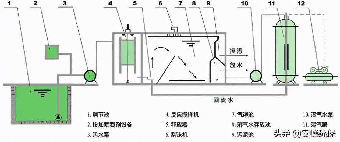 处理过的部分废水循环流入溶气罐,在加压空气状态下,空气过饱和溶解,然后在气浮池的入口处与加入絮凝剂的原水混合,由于压力减小,过饱和的空气释放出来,形成了微小气泡,迅速附着在悬浮物上,将它提升至气浮池的表面。从而形成了很容易去除的污泥浮层,较重的固体物质沉淀在池底,也被去除。