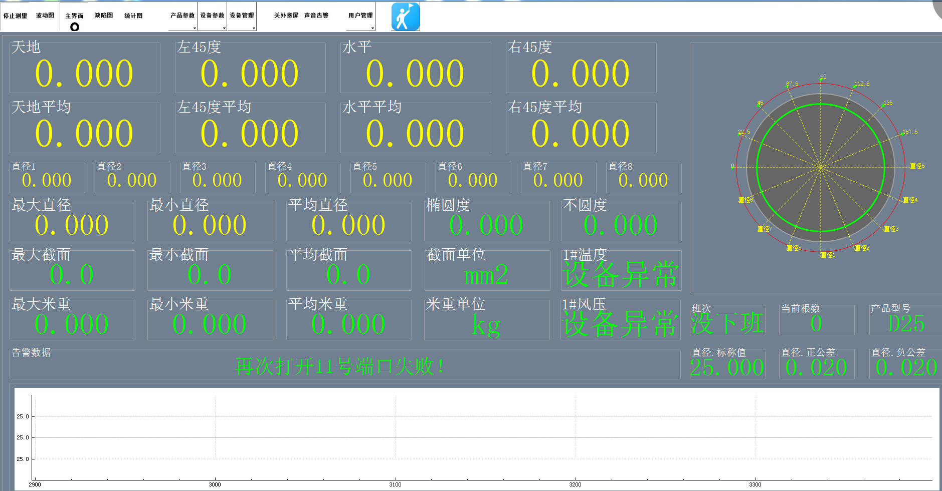 目前很少有大直径的检测设备,大直径测径仪也是技术工程师经过多年研发而制成的检测设备,具有固定间距双测头与间距可调双测头两种,圆满完成大直径的检测。同时根据轧材的行进方式,可选择两种不同方式完成椭圆度的检测,轧材自旋转,一组测头即可,轧材平直行进,则可安装2组垂直分布的测头。
