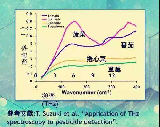 在生物医学上面,太赫兹的频段能够直接探测到生物分子的信息,这是其他电磁波段无法无法比拟的。因此可以对食品中的地沟油、蔬菜水果中的农药、奶粉中的三聚氰胺等进行检测。