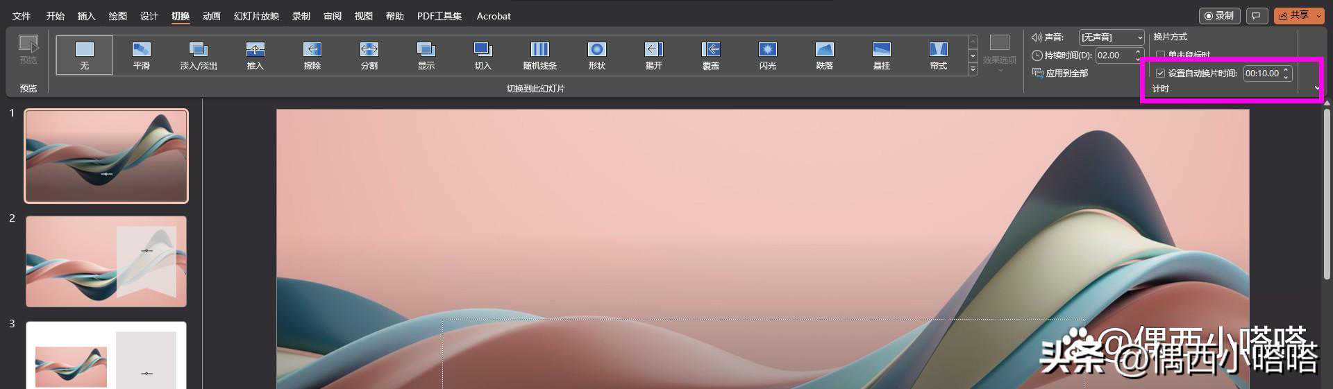 2、右侧找到设置自动换片时间,输入时间后,该页会计时自动切换。