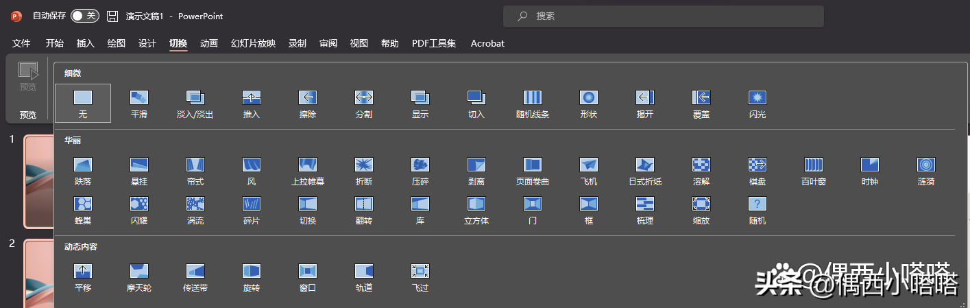 PPT切换有3种方式,分别是空格(或回车)键切换、鼠标单击左键切换、设置时间自动切换,同时还支持切换显示特效(动画)。
