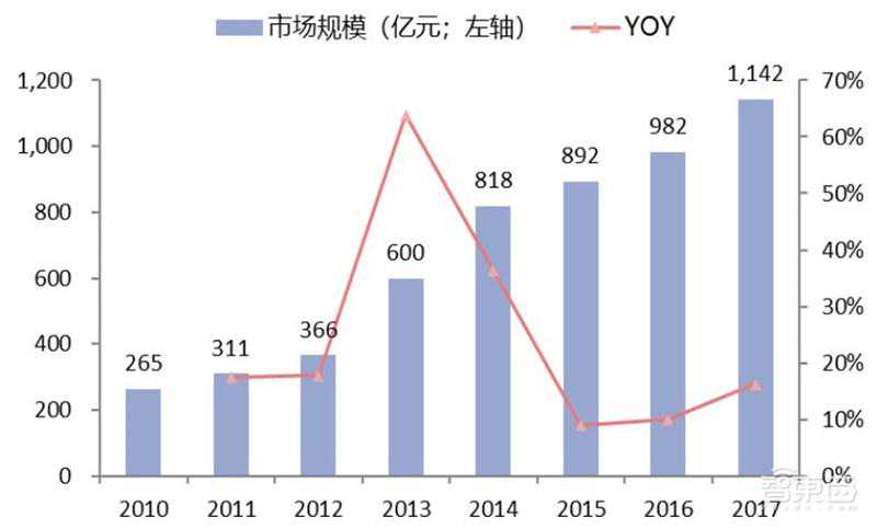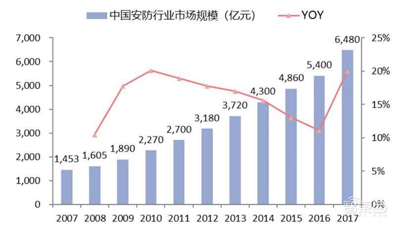 回顾过去十年,复合17%的行业增长率证明了行业的持续性,龙头份额提升持续获得超越平均的增速。根据慧聪安防网的历史数据,2008年至2017年,十年内中国安防行业产值从1605亿元增长到6480亿元,十年复合增长率达17%。其中,安防产品占安防行业规模约3~4成,2017年中国安防产品产值约2000亿元。