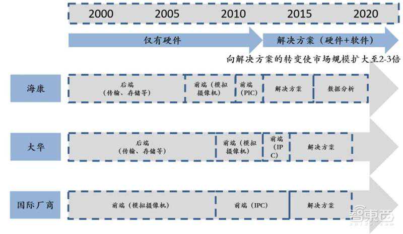 海康、大华营收增速领跑市场的重要因素之一是产品线不断拓展,潜在目标市场(TAM)迅速打开。龙头企业不仅抓住了前两波技术创新和模式创新,而且不断增加自身产品线,开拓TAM。海康起家于后端的板卡供应商,2004年切入后端设备DVR,2007年开始布局前端摄像头,2012年提出IVM可视化管理理念,直到2014年才单独披露中心控制设备营业额,产品线覆盖日益齐全后提出一体化解决方案,2013~2015年实现了解决方案转型。