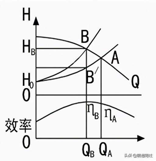 a、改变排出侧流量调节阀开度。如关小阀门时,管路曲线H0A变到H0B,流量由QA减少到QB,节流调节简便易行,应用普遍,但泵的效率从ηA减少到ηB,因此该方法并不经济。
