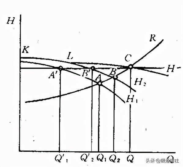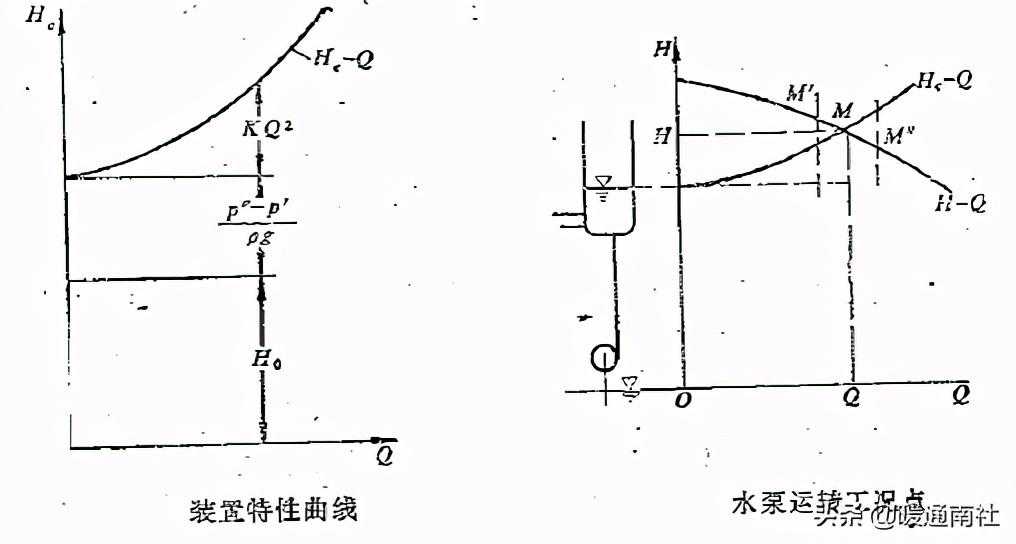 水泵运转工况点,装置特性曲线与泵特性曲线同画在一个Q-H坐标平面内,此两线相交于M点,则M点既是水泵运转时的工况点又是装置的特性点,在这一点,水泵扬程等于装置扬程,这时候单位重量的液体流过水泵时从水泵处得到的能量为H,正好把单位重量的液体从吸水池表面移到压水池表面所需花费的能量也是H,于是能量平衡;