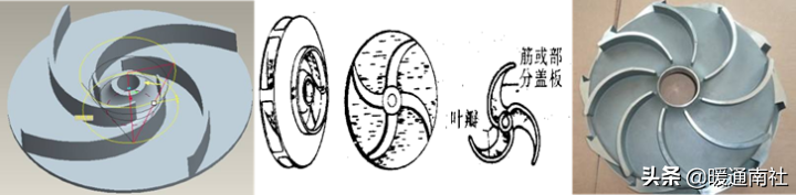 叶轮型式有闭式、半开式、开式三种,闭式叶轮效率较高,开式叶轮效率较低;叶轮又可分为单侧吸人式和双侧吸人式,当流量小于300m3/h,多采用结构较简单的单吸式叶轮。