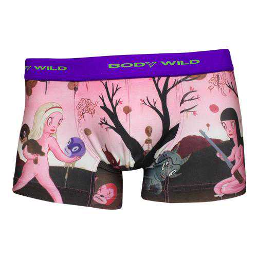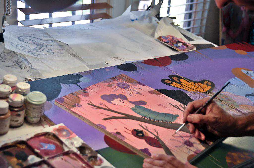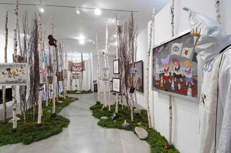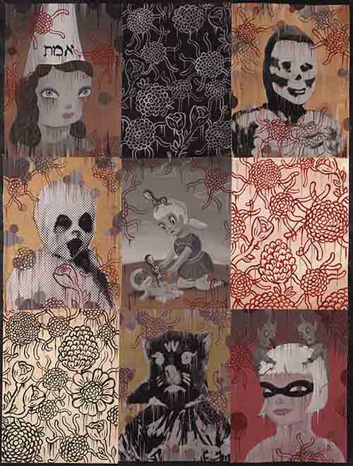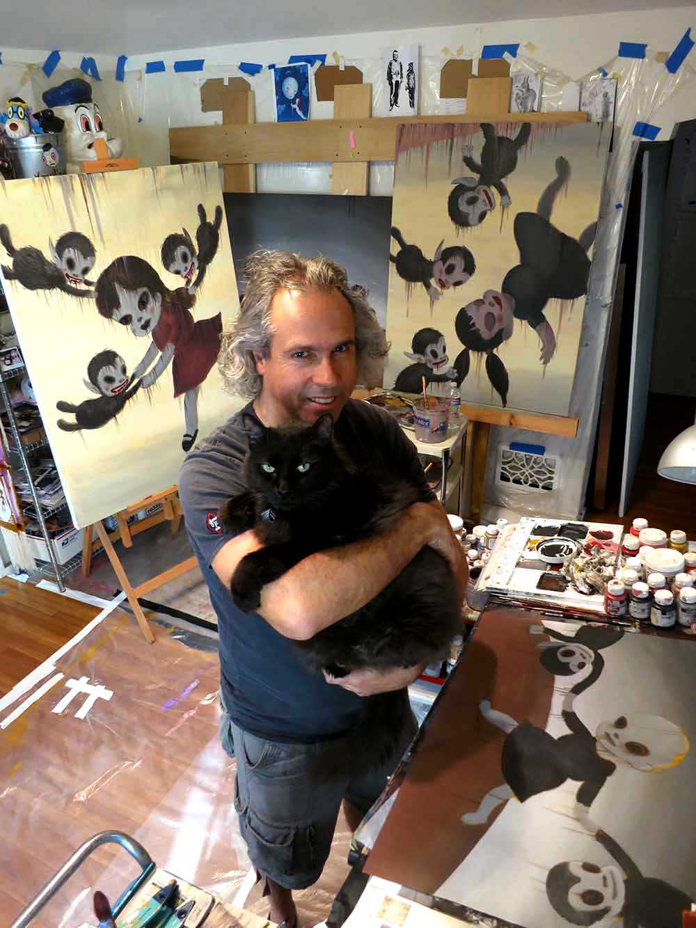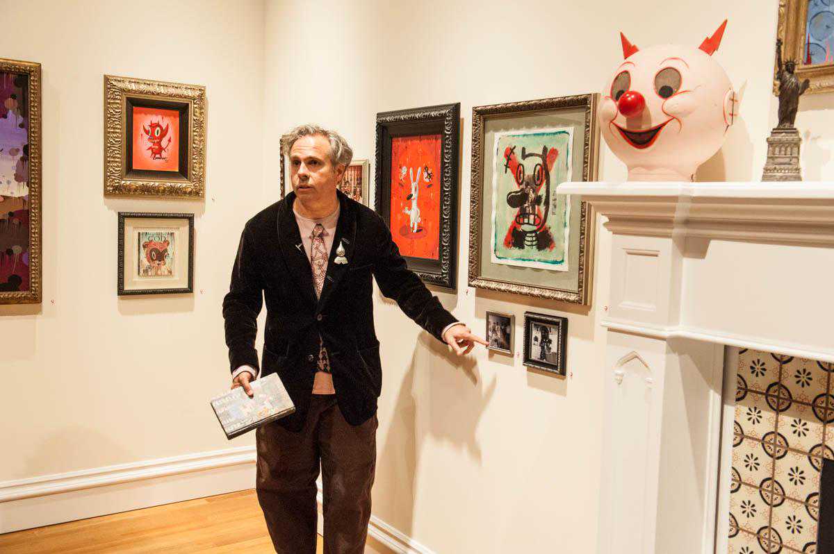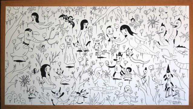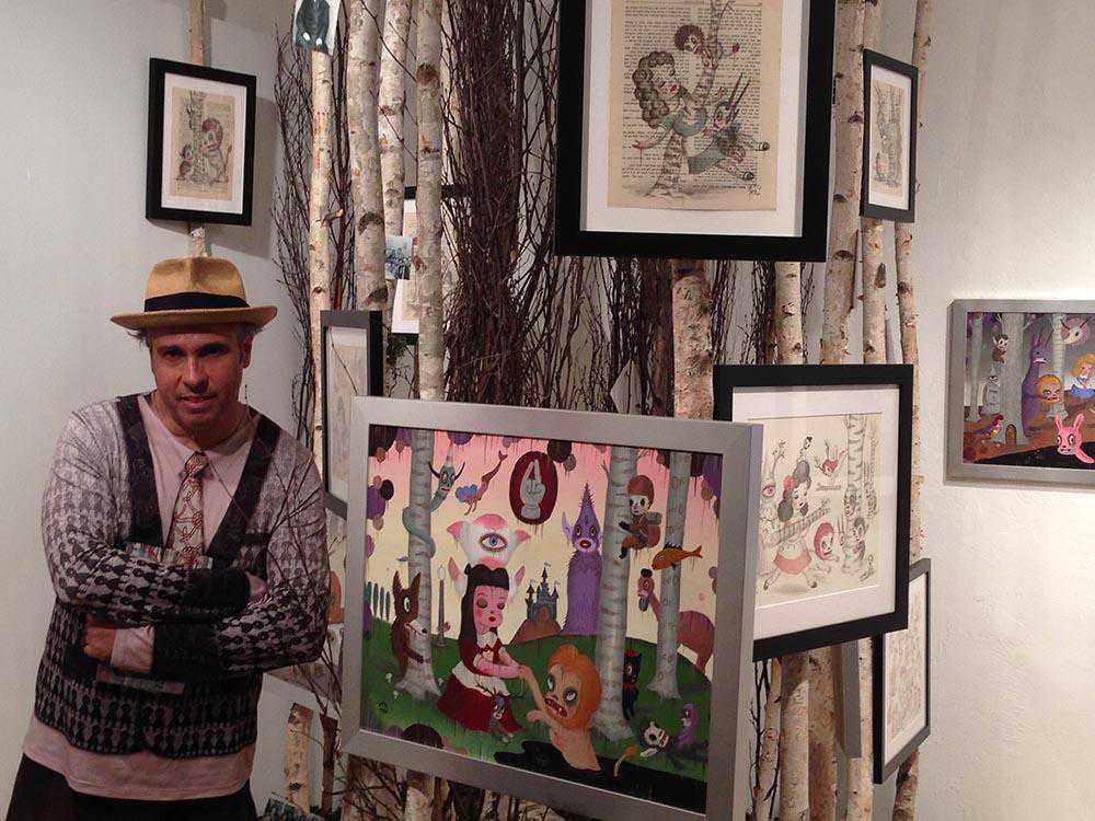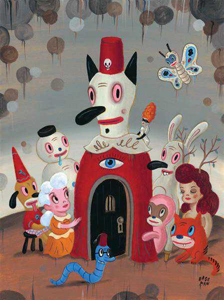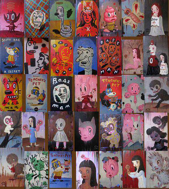 首先,在他周围有一批和他类似的被传统画廊排挤的小画家,这些人有一些共同的特点:基本都深受迪斯尼卡通影响;都喜欢在木板上画小画;内容黑暗怪诞,充满色情和暴力(又称粗俗艺术);大都没有受过正规训练,喜欢随便乱画,所以在画廊看来实在是不登大雅之堂……但是他们却创造了很多让人过目不忘的形象,例如盖瑞·贝斯曼的充满欲望的雪人、CamilleRoseGarcia的黑暗女巫。这些“怪物”都有一个完整的属于自己的世界,他们在里面有朋友有敌人,并演绎自己的故事。所以这些艺术家的作品一般尺幅不大,装饰味道很浓,内容却有很强烈的故事性——从这一点也可以看出,里面很多人是画插画或漫画出身,或者是街头涂鸦者,外界如今一般称这些人为“南加州画派”。