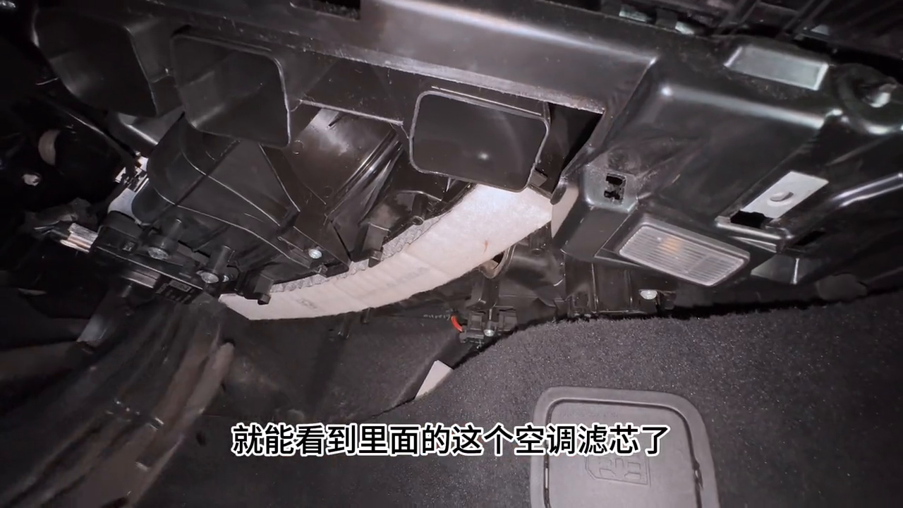 ·然后里面有一个弧形的小盖板,也有几个扣子,给它拧开。拆掉小盖板以后就能看到里面的空调滤芯了。原厂滤芯是两年或者2万公里换一次,早一点、迟一点也要根据具体的用车环境调整,早点换只有好处。