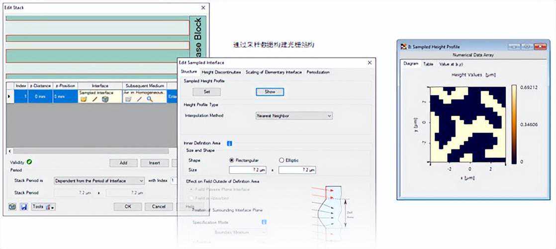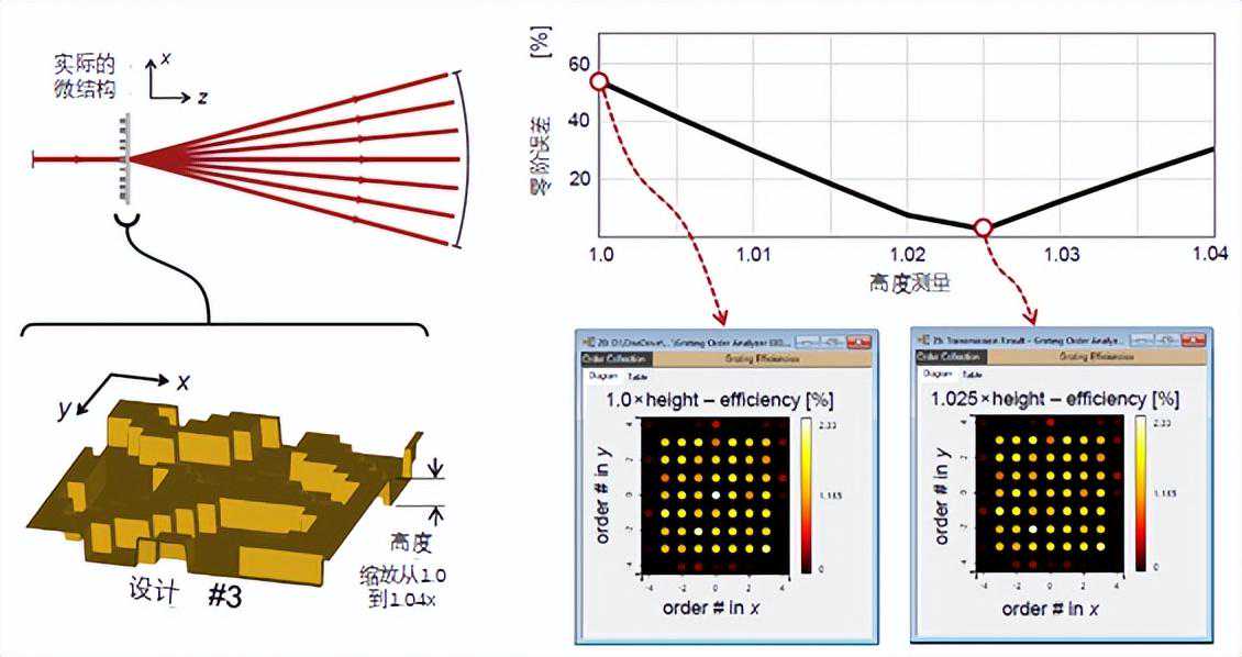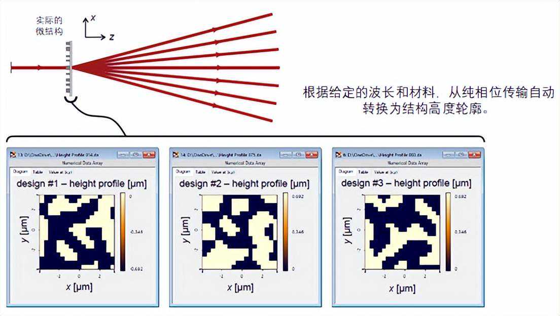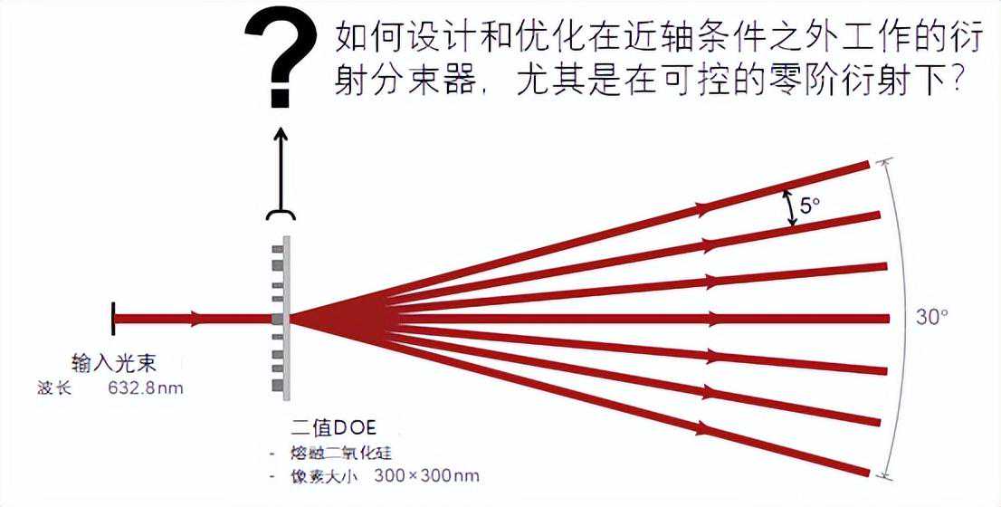直接设计非近轴衍射分束器仍然是很困难的。由于有相对较大的分束角,元件的特征尺寸一般等于或小于工作波长。因此,它通常超出近轴建模方法的范围。在此示例中,将迭代傅里叶变换算法(IFTA)和薄元件近似(TEA)用于衍射元结构的初始设计,然后将傅里叶模态法(FMM)应用于严格的性能评估。