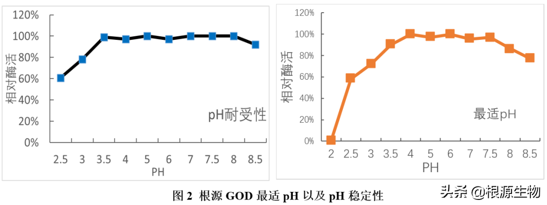 动物肠道不同的位置pH是不同的,如果酶制剂在动物体内不同的pH环境下都能发挥最适酶活作用是最好的,但是酶制剂的本身的性质决定这是不可能,酶制剂的最适反应pH是唯一的,因为动物吸收营养的主要是在肠道中,肠道中pH一般在中性左右,也就是说酶制剂的最适pH范围越广越好。根源GOD最适pH为6.0,作用范围在~8.5可保留最大酶活力80%以上(图2右)。
