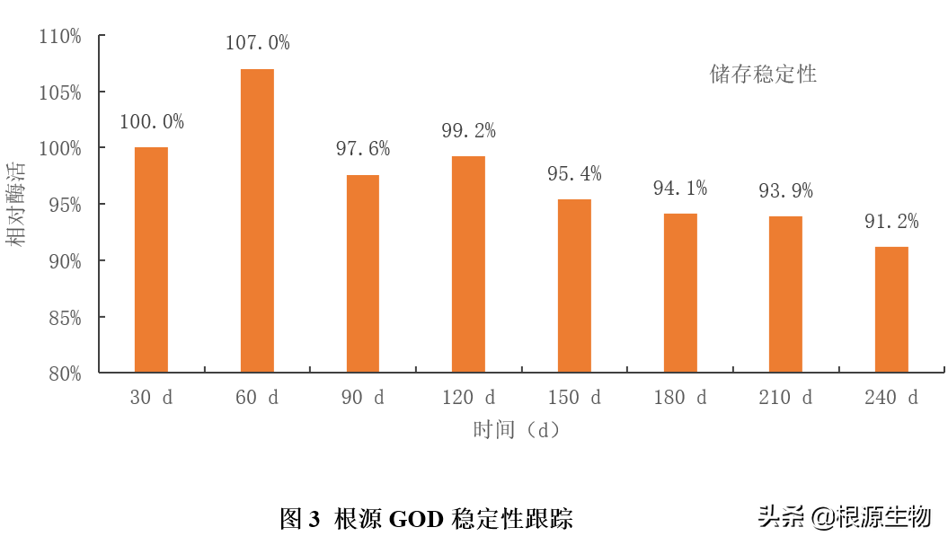 饲料厂订购和使用酶制剂产品是有一定的备货期,所以酶制剂的储存期的稳定性也是非常重要的,酶活在货架期内损失越小表明酶品质越高。在室温条件下,连续跟踪根源GOD产品8个月的存留数据,酶活存留率率为91.25%(图3)。