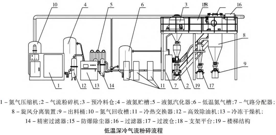 低温深冷气流粉碎系统主要由氮气压缩机、液氮贮槽、预冷料仓、液氮汽化器、气流粉碎机、防爆除尘器等组成,气流粉碎介质为氮气。