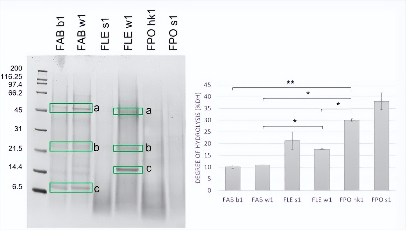 水解度最低的是超声辅助萃取,但它显示了相当高的消旋程度,降低了蛋白质的质量,水提液尽管提取率低,但却提供了最纯净的蛋白质提取物。
