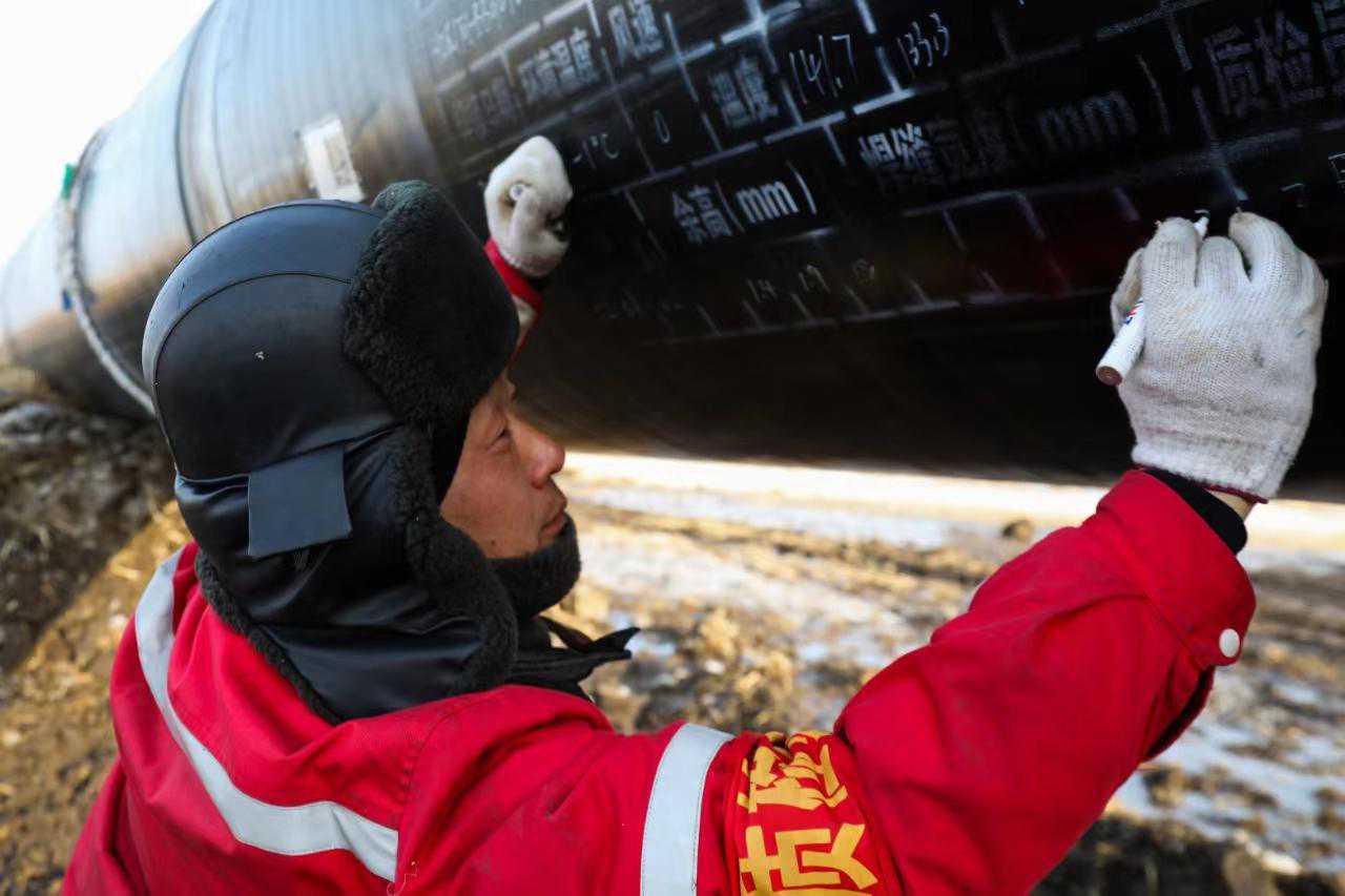 午后的阳光带来一丝温暖,残存的冰雪随着冰冻一冬的泥土逐渐开化。在位于岔路口镇的自动焊二机组施工现场,机械轰鸣、人头攒动,40余名机组人员正踏着泥泞紧张忙碌着,倒春寒下是一片施工热。质检员王昱正拿着焊检尺对焊接完成的焊口仔细测量,每测量完一处点位,就把数据填写在管道上喷涂的表格里,焊口周围的地面到处都是他留下的脚印。在焊接工程车的轰鸣声中,两名管工正操作对口器进行管线组对,红色的工服溅得到处都是泥点。焊接棚内,两名焊工正在紧张施焊,飞溅的火花让仅能容纳两人的焊接棚格外耀眼。远处,一根根加工完坡口的管材正被源源不断地运往施工第一线……