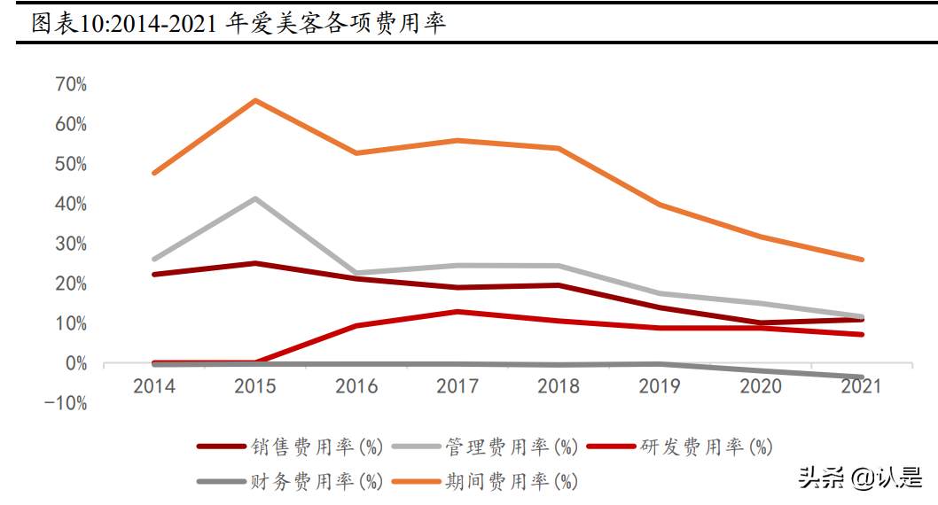 公司占据上游优势盈利能力优异。爱美客作为上游厂商拥有高壁垒和高行业集中度优势,相较产业链中下游渠道话语权更强,产品推广阻力较小,同时依托自身差异化产品矩阵精准把握市场需求,近年来一直保持着90%左右的毛利水平,波动较小。而公司净利率则呈现上升趋势,2018年始提速明显,2021年达到66.12%,同比增加5.02pcts,一方面系公司发展逐渐迈入正轨、研发体系及渠道管理成熟、规模效应显现、期间费用率下降所致,另一方面与嗨体熊猫针及濡白天使等高附加值产品占比提升有关。2014-2021年间公司期间费用率由47.6%下降至25.83%。