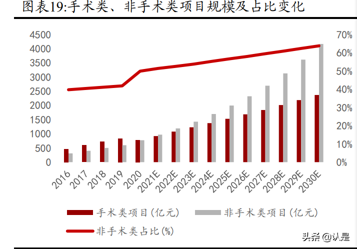 非手术类医美项目获青睐,微整形、轻医美成为大趋势。医美的主要类型分为手术类及非手术类,手术类医美包括五官、皮肤、口腔、躯体等部位,常见项目包括重睑术、隆鼻术、隆胸术等;非手术类主要是通过注射、激光及其他基于能量的皮肤治疗,常见项目包括玻尿酸注射、光子嫩肤及激光脱毛等。相较于手术类医美项目,非手术类项目具备风险系数低、价格相对较低、创口小及康复期短、术后可调整性强的特征,迎合了大部分预算较低、时间紧张、预期调整范围小及风险承受能力较低的消费者需求,并伴随着新项目的不断涌现逐渐成为医美消费主流。